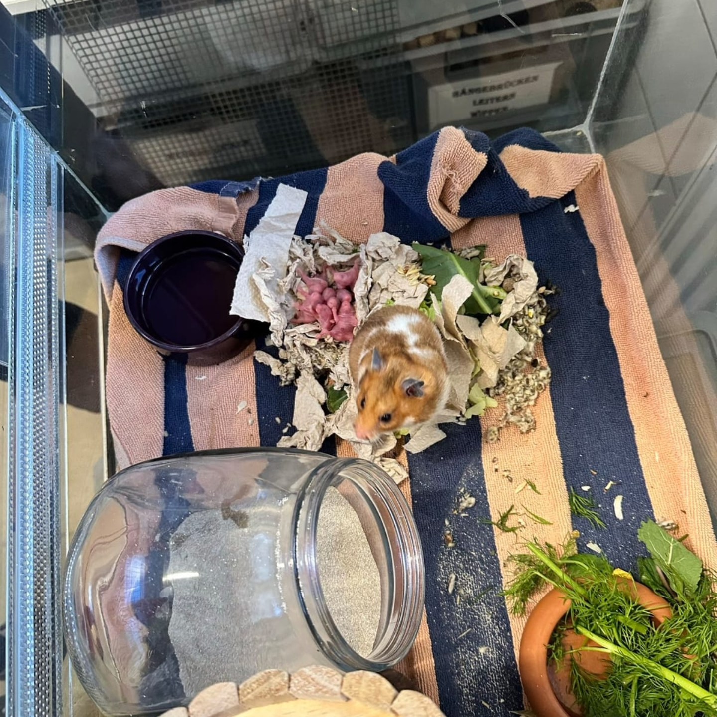 2 Elternteile und 5 Jungtiere wurden bei uns abgegeben… Doch schon bei der Eingangsuntersuchung war klar, die Hamstermama ist schon wieder tragend.
