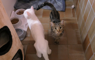 Charakter: Schweren Herzens wurden die 2 ungleichen Brüder bei uns abgegeben. Mit Kos und Korfu holt man sich nicht nur viel Liebe sondern auch ständige Begleitschaft ins Haus. Während sie anfangs noch verunsichert waren, blühen sie überraschend schnell im Tierheim auf und sind allem und jedem sehr neugierig gegenüber. Die großen Kater sind menschenbezogen verschmust und extrem neugierig. Kos (reinweiß) hat zum Glück trotz seiner Farbe keine Probleme mit dem Sehen oder Hören. Kleinere Kinder werden vermutlich kein Problem, andere Katzen finden Sie interessant doch die beiden würden vermutlich lieber ein leeres Haus mit Liebe füllen. Die einzige Bedingung, die beiden müssen zusammen bleiben. Denn auch hier zeichnet sich klar ab, es wird sich gegenseitig geputzt, aus dem gleichen Napf gegessen und im gleichen Bett geschlafen.